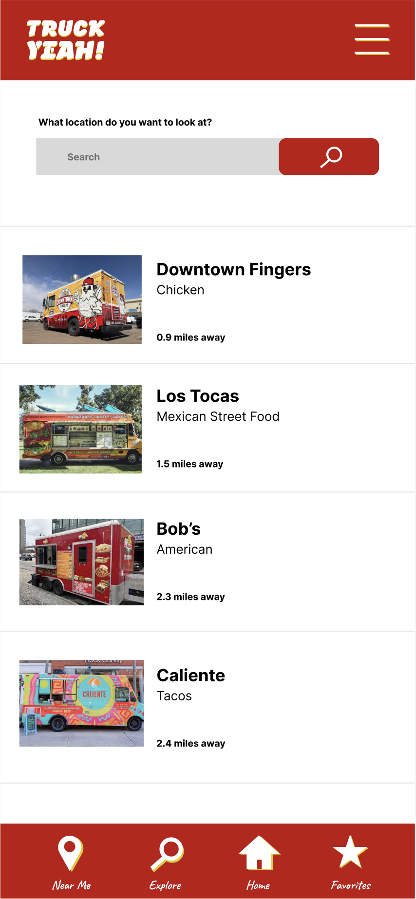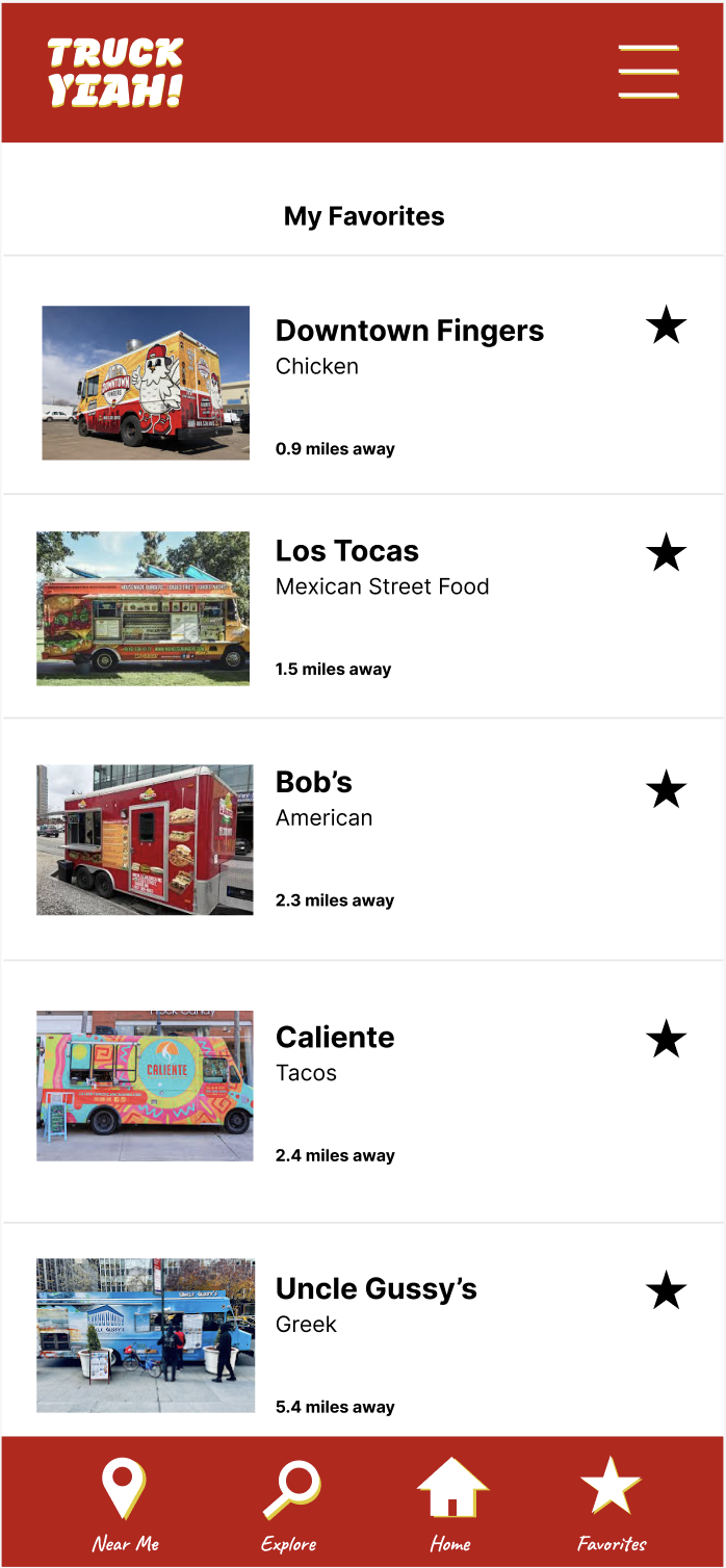Truck Yeah! was created to solve a common friction point in food truck culture: discovering great food is easy, but finding reliable, up-to-date information isn’t. Unlike broad restaurant platforms, the app is purpose-built for food trucks, allowing patrons to locate nearby trucks in real time, explore new vendors, and view weekly schedules without digging through social feeds or outdated listings. By centering the experience around mobility and spontaneity, Truck Yeah! supports how people actually interact with food trucks—on the go, in the moment, and often with limited time to decide.